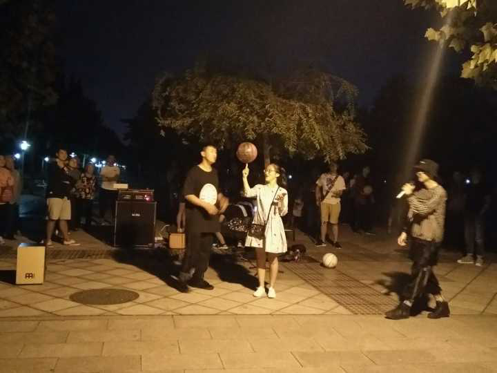 演出活动伊始,天空中落下了零星的雨点,但是这并没有影响到演出的热情。每一位表演者都拿出了最好的状态,在场的每一位观众也都热情高涨。开场第一首歌由吴昱呈与张艺馨带来,美妙的歌声吸引许多路人驻足观看。接下来由花式篮球协会带来,同时我们新加入的成员王勇也在伴奏中即兴表演,音乐与运动之间的完美融合赢得了观众一阵阵的掌声。