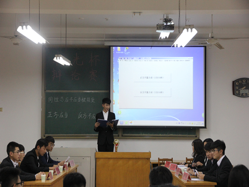 11月17日晚由K体育·(sports)官方网站主办的“物光杯辩论赛”决赛在15号教学楼341教室举行。本场辩论赛的主题为“同性恋应不应该被接受”。正方的四位参赛队员为傅尧、张泽鹏、罗嘉豪、刘树晨。反方四位参赛队员为应诗媛、董冰蟾、蒲秀江、冯言泽。本次比赛主持人为张可奇,评委团由周力、马育新、于松灵组成,评分工作由赵文涵负责。