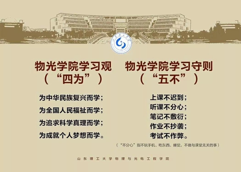 学习观(“四为”)从国家、人民、知识、个人四个层面定义,学习守则(“五不”)从课上、课间、课下三个角度做出规定。内容如下: