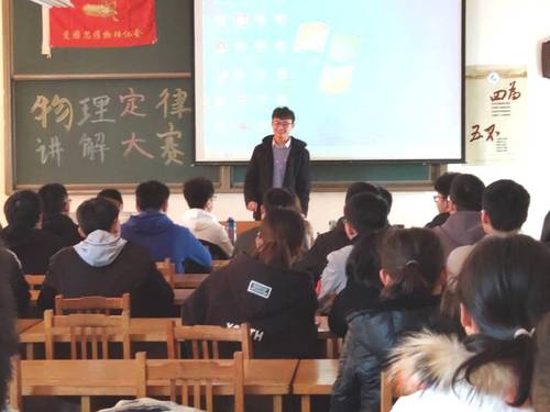 活动伊始,于立军向参赛人员介绍活动评委及活动流程,于立军表示:此次活动的目的是使同学们更好的了解物理并提高在实际生活中应用物理知识的能力。随后,参赛者按照一定的次序上台,利用PPT向同学们讲解物理定律。参赛者主要介绍了他们所选的物理定律的来源及演变过程,负责答疑的同学对评委提出的问题加以解答。臧笑妍、王璇小组向同学们讲解“光的折射”定律,“光通过光学性质不均匀的介质时,在偏离正常光的传播方向上有光出射的现象叫做光的折射”,路梦雅以举例子的方式系统阐述这一定理,并在讲解过程中与在场同学进行友好互动,获得同学们的热烈掌声。谢立朝、臧珊珊、田梦小组针对“动量守恒”物理定律进行讲解,通过“小鸟撞飞机”的现实例子进行引入,并讲述“动量守恒”的推导过程,引起同学们的认真讨论。活动最后由于立军总结此次活动并对同学们的表现加以点评。此次活动大家积极参与,讲解各种物理定律,展现出来同学们丰富的物理知识。
