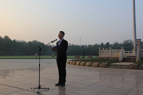 升旗仪式伊始,校学生会国旗班成员迈着铿锵有力的步伐护送国旗入场。庄严的国歌奏响,全体成员向冉冉升起的国旗行注目礼。随后,青年学生代表张宇杰发表题为“献礼七十华诞,你我砥砺前行”的国旗下演讲。