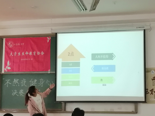 10月27日下午,大学生生命教育协会在15号教学楼342教室举办“不熬夜,健身心”决赛答辩活动。大学生生命教育协会会长孔倩,大学生生命教育协会工作人员和各答辩人员参与此次活动。