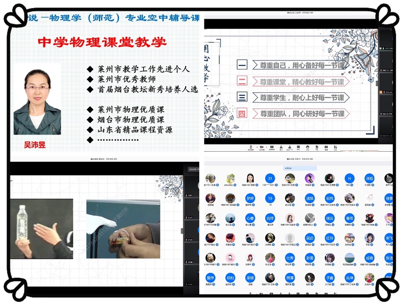2020527日,第一期报告主讲老师为我校物理师范专业2006届毕业生吴沛昱。吴沛昱现为烟台莱州文峰中学优秀物理教师莱州市教学工作先进个人、莱州市优秀教师,有着丰富的中学执教和教学比赛经验,多年来潜心一线教学并致力于课程建设,吴老师执教的课程多次被评为莱州市物理优质课、烟台市物理优质课、山东省课程资源。吴老师报告的主题为《中学物理课堂教学——用心教学,从每一节课做起》。吴老师从“尊重自己,用心备好每一节课;尊重课堂,精心教好每一节课;尊重学生,耐心上好每一节课;尊重团队,用心研好每一节课”四个方面系统地为同学们讲述了中学物理课堂教学的理论知识及其在实际教学中的应用,并向大家展示了自己精心制作的生动形象的物理实验微课,鼓励师范生注重自身素质和教学技能的培养。此外,吴老师从评审的角度给大家介绍了教师资格证面试环节和教师编考核环节需要注意的事项。最后,K体育·(sports)官方网站老师和同学们与吴老师进行了交流讨论。吴老师亲切、幽默地与同学们互动,回答解决同学们在学习生活中遇到的各种问题。同学们纷纷表示,要向优秀校友学习对待教学严谨认真的态度,坚定今后用心学习,做一名合格的师范生,将来用心教学,做一名合格的教育者