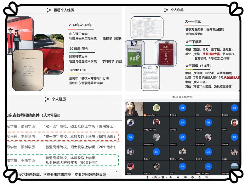 202063日,第二期报告主讲人为K体育·(sports)官方网站2014级物理学师范生孟萌,2018年考入陕西师范大学学科物理专业攻读硕士研究生,2019年底通过淄博市“名校人才特招”行动顺利签约山东省淄博第六中学。孟萌报告的主题为《物理师范专业学习及学业规划》,主要从“专业学习规划、读研与实践、就业校招经验分享”三个方面展开,报告内容对于在校生可以说是实实在在的干货,尤其是为部分正在迷茫的师范生明确了努力的方向,明确定位、学会自律、努力不放弃是迈向成功的开始。同学们听得很认真讨论很热烈。最后孟萌用两句话激发鼓励学生“你说热爱游戏,热爱篮球,热爱美妆,热爱旅行,是的,没有人可以剥夺它们,但是生活可以。”“在你为自己的未来踏踏实实地努力时,那些你感觉从来不会看到的景色,那些你觉得终身不会遇到的人,正一步步向你走来!”