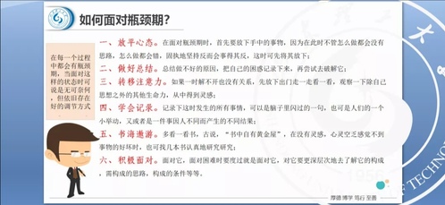 亓鹏还指出,我们在学习生活中都会遇到瓶颈期,当面对这样的状态时我们可以通过调整自己的心态来突破瓶颈。老师结合实际情况,从“放平心态”、“做好总结”、“转移注意力”、“学会记录”、“书海遨游”、“积极面对”等六个方面进行了方法讲解,为同学明确如何突破自己的瓶颈。使同学们认识到瓶颈期不可怕,合理的调节自己的心态就能很好的度过这一阶段。