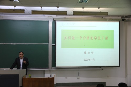 会议伊始,董云会从学生干部应有的素质、学生干部应具备的能力、学生干部人际协调能力的重要性、学生干部时间管理的方法与艺术四个方面来讲解如何最好一名合格的学生干部。首先,他指出,作为学生干部应具备政治素质、学习素质、心理素质以及大局意识。做事情不要朝三暮四,要坚定信念坚持下去。与同学之间的关系处理,不能情绪化,要学会冷静。虽然作为学生干部,但学习不能放松,学生干部作为一个榜样,更应加强学习。要随时准备牺牲自己的时间,比其他同学多一份责任感。
