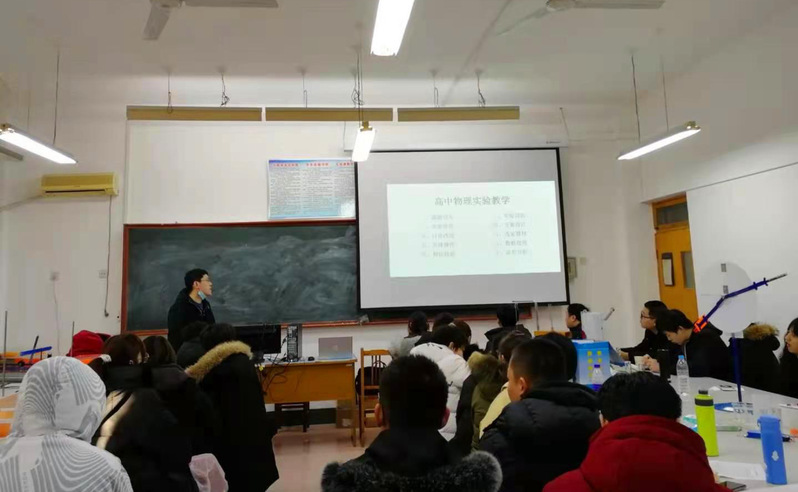 周谋远作了题为《对初中物理课程的教材理解》的报告,他从新时代中学生的特点入手,分享了初中物理的课程目标与理念、实验与物理学科的关系、中学物理示范课、山东省师范类高校学生从业技能大赛体会;赵玉亮以《中学教育之“变”》为题,分析了当今教育正在经历着一场重大变革,与此相对应的教育顶层设计、社会和家长、教师、学生也在发生改变,并从学校和教师两方面谈了了“应变”指导方针;李双印从学生习惯养成、班干部作用、班风建设、班主任的“桥梁作用”等方面谈了如何发挥班主任的重要作用,重点分析了班主任如何与任课教师、家长及学生进行有效沟通;张晓文作了题为《核心素养导向的物理教学漫谈》的报告,从新课标与高中物理学习障碍、高中物理教学设计、高中物理课堂教学实施、高中物理教学评价四个方面谈了如何做好高中物理教学;于文明以《执着向往 不忘初心》为题,从班级文化建设、小组合作管理模式、学生管理等方面,利用案例分析的方式,讲述了如何成为一名优秀的班主任;李勇深入《中学物理实验》课程课堂,为学生上了一堂生动的实验教学示范课。