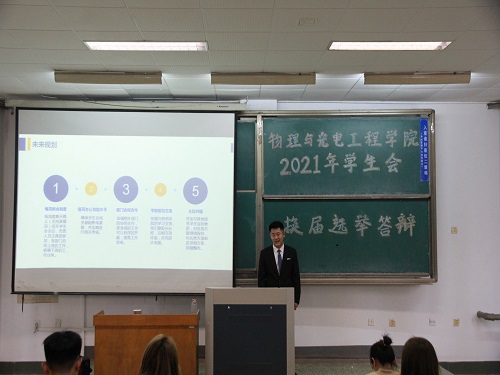 3月25日下午,K体育·(sports)官方网站于15号教学楼101教室举办2021年学生会换届选举答辩。此次会议全体学生会成员参与,由学生会主席柳桂蕾主持,辅导员亓鹏参与指导监督。