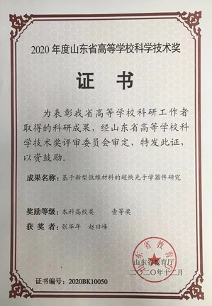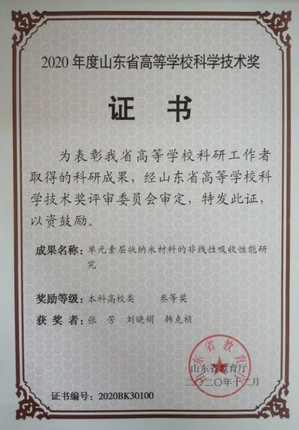 近日,山东省教育厅公布了2020年度山东省高等学校优秀科研成果奖获奖名单。经学校推荐、形式审查、专家评审,K体育·(sports)官方网站张华年副教授和张芳博士分别获得科学技术奖一等奖、三等奖。