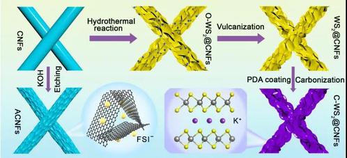 研究人员发现,作为支撑骨架和生长模板的碳纳米纤维可以实现WS2纳米片的均匀生长,改善储钾反应动力学,并促进电化学转化反应;碳包覆可缓冲电极充放电过程中的体积膨胀,增加电极导电性。作为钾离子电池负极,该电极材料表现出优异的储钾比容量和倍率性能。基于原位拉曼、原位X射线衍射、非原位透射电镜以及第一性原理计算,阐明了WS2与K+的储钾反应机理,即插层反应(WS2→KxWS2)和转化反应(KxWS2→K2S5→W+ K2S)相结合的反应机理。基于该电极材料构建的钾离子电容器表现出180.4 Wh kg-1的能量密度,这是目前国际上报道的最高水平之一。