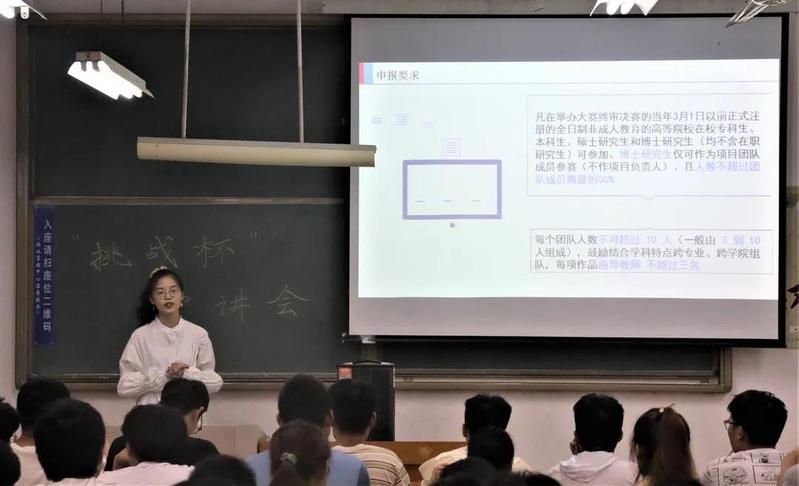 活动伊始,孙莹从参赛方式、大赛章程及收获、大学生竞赛概况等方面详细为同学们介绍。她指出,作品必须是据竞赛申报日前两年内完成的学生课外学术科技和社会实践活动,而毕业设计和课程设计、学年论文和学位论文、国际竞赛上获奖的作品、获国家级奖项成果等不在申报范围之列。