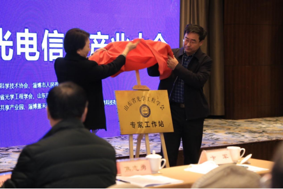 开幕式上,学会秘书长焦志勇淄博市科协主席卞军,共同为山东省光学工程学会驻淄博齐鲁激光共享产业园专家工作站揭牌