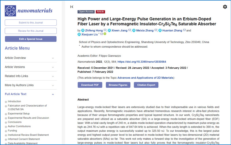 近日,《Nanomaterials》(IF: 5.076)在线报道了K体育·(sports)官方网站刘晓娟副教授及合作者在光纤激光技术领域的重要进展。原文链接:https://doi.org/10.3390/nano12030564。