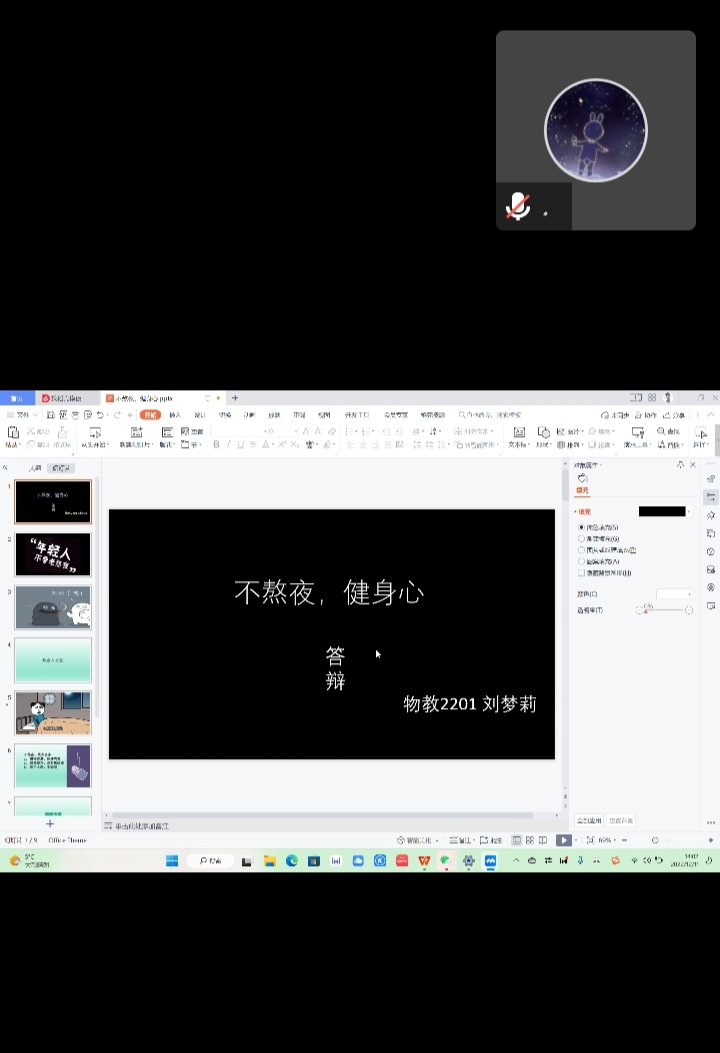 活动伊始,马云萍为大家介绍比赛注意事项及比赛规则。她指出此次活动旨在让同学们展示个人近期不熬夜成果,呼吁更多同学能够规律作息。随后,各答辩选手通过PPT为同学们分析熬夜原因、介绍熬夜危害,并呼吁更多人参与“睡眠小镇”,让自己每天保持精力充沛。