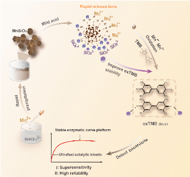 具有高催化活性和底物特异性的天然酶已被广泛应用于工业、医学和生物等领域。尽管有着很好的前景,但它们往往存在高成本、低操作稳定性和在极端条件下难以储存的问题。自2007年发现具有类辣根过氧化物酶活性的磁性纳米粒子以来,纳米酶的快速发展为解决这些挑战提供了机会。通过工程化手段调控纳米酶的理化性质(如结构、表面化学、周围环境等)可以调节其活性。尽管如此,其对底物较低的亲和显著降低了催化动力学,导致灵敏度不够理想。个体操作时间的差异带来的干扰很大程度上影响了检测结果的准确性,存在可靠性差的问题。