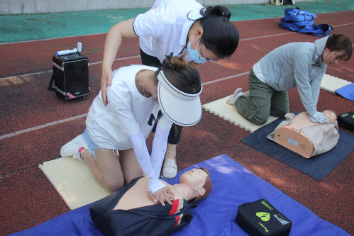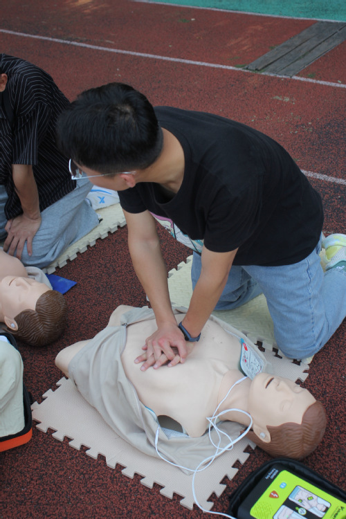 首先,红十字会工作人员讲述了一些简单的急救方法,包括如何进行心肺复苏以及如何使用AED进行急救,并用模型给同学们进行示范,手把手教同学们实践应用。