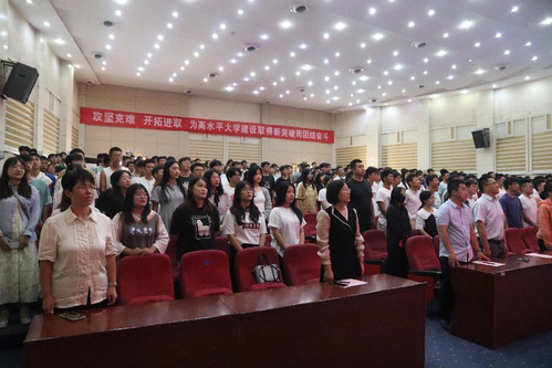 会议伊始,奏唱国歌。教师代表微电子科学与工程系主任周通发言。周通老师结合自身专业和求学经历,从“军训的意义”和“中兴事件”出发为新生在大学期间的学习规划和人生道路指明方向。他从《普通物理》课程中“力热电光”的知识出发,对全体新生提出了“物光人足下要有力”“物光人手里要有热”“物光人脑中要有电”“物光人眼里要有光”等四点希望和要求,鼓励全体新生要牢记习近平总书记的嘱托,珍惜宝贵的青春年华,坚持理想、脚踏实地,勤于学习、善于学习,打牢知识功底、积蓄前进能量,勇于探索、勇于突破,不断认识科技世界新领地,立志报效祖国、服务人民。
