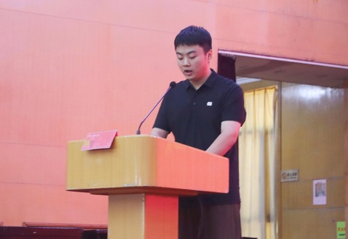 在校生代表物教2002班钟昭向2023级全体新同学表达了诚挚的欢迎,并讲述了自己大学期间的学习成长经历。他建议全体新生要立鸿鹄志,志存高远,做“梦想人”;要脚踏实地,夯实根基,做“奋斗人”;要养好习惯,明德修身,做“规矩人”。