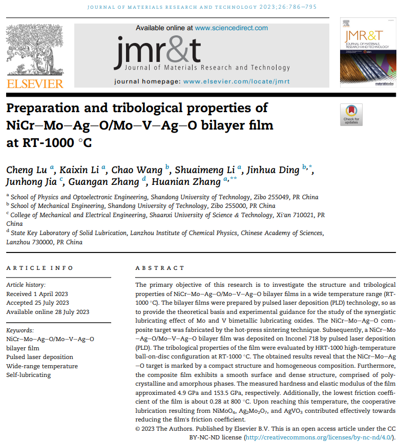 Mo/V双金属氧化物的协同润滑在高温摩擦过程中起着非常重要的作用。为此,鲁成博士与其合作者研究了脉冲激光沉积制备的NiCr-Mo-Ag-O/Mo-V-Ag-O 双层薄膜的高温摩擦学性能,及其微观结构演变过程。研究结果表明,利用自制的多组分靶材及脉冲激光沉积技术制备的双层薄膜由多晶及非晶相构成,组分均匀,结构致密。在800 ℃摩擦温度下,双层薄膜的摩擦系数在NiMoO4、Ag2Mo2O7和AgVO3的协同润滑作用下降低至0.28。这些结果对高温润滑薄膜的研究具有重要意义。相关成果以“Preparation and tribological properties of NiCr-Mo-Ag-O/Mo-V-Ag-O bilayer film at RT-1000 °C”为题,发表在材料类知名期刊Journal of Materials Research and Technology上,鲁成博士为该论文的第一作者,K体育·(sports)官方网站为第一单位。