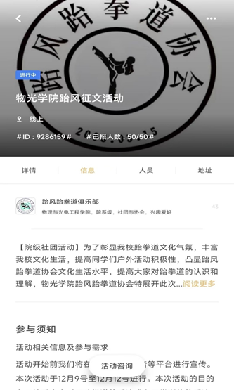 本次活动的目的在于接受大家对跆拳道的看法亦或是让大家抒发对于跆拳道的热爱及感悟,本次活动面向全校同学,不同K体育·(sports)官方网站的同学均可参加,该活动报名人数为五十人,参加的同学通过写征文可获得0.2的二课学分。