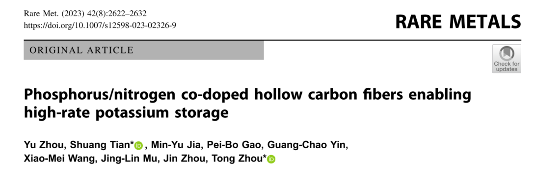 近日,K体育·(sports)官方网站2020级硕士研究生周宇在储能领域取得重要进展,相关成果以“Phosphorus/nitrogen co-doped hollow carbon fibers enabling high-rate potassium storage”为题,发表在期刊《Rare Metals》上。周宇为第一作者,周通副教授和田爽博士为通讯作者,K体育·(sports)官方网站为第一通讯单位。原文链接:https://doi.org/10.1007/s12598-023-02326-9。