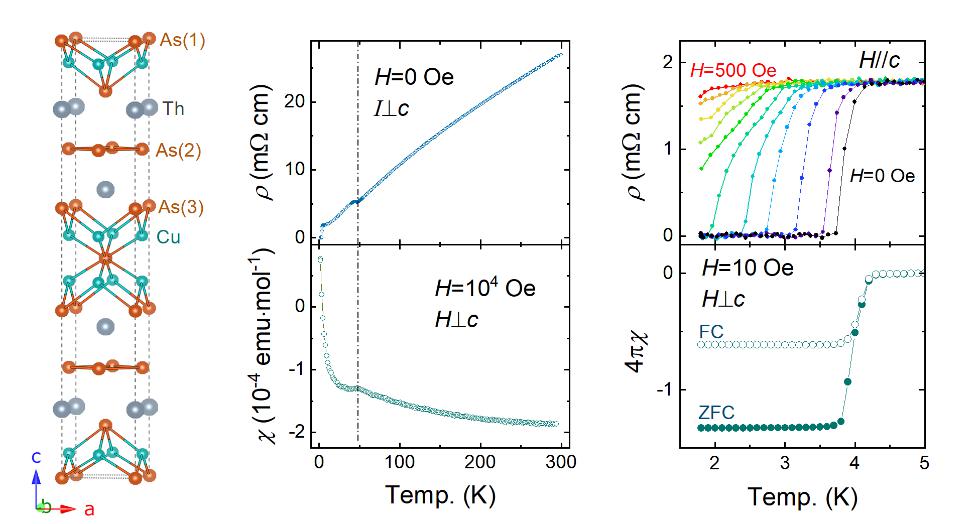 该论文报道了一种新型铜砷化物超导体Th2Cu4As5。其结构可看作萤石型Th2As2载流子库层与双层反萤石型Cu4As3导电层沿c轴方向交替堆砌而成。该材料在4.2 K发生超导转变,此外还在48 K表现出类似电荷/自旋密度波相变的行为。这一发现不仅为研究超导电性与密度波相变的共存机制提供了少见的实例,还开辟了基于双层反萤石型导电层的超导物理研究方向。