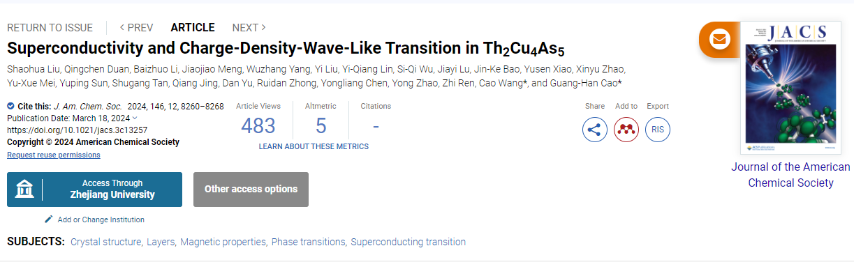 近日,K体育·(sports)官方网站王操老师领衔的团队在新型准二维超导体的结构探索领域取得重要进展。相关论文“Superconductivity and Charge-Density-Wave-Like Transition in Th2Cu4As5”发表在化学类顶尖期刊《Journal of the American Chemical Society》。该论文第一作者为K体育·(sports)官方网站2021级硕士研究生柳绍华同学,王操副教授为共同通讯作者,K体育·(sports)官方网站为论文第一通讯单位。