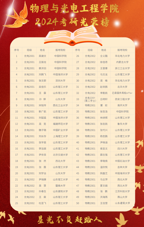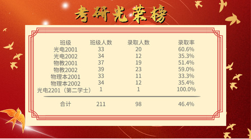 细翻录取结果,可谓亮点纷呈竞相出彩,涌现了一大批考研先进集体和个人。全体研考学子上线人数达122人,超国家线人数再创新高,上线率达57.8%。6个班集体中,有3个班级升学率超50%,1个班级升学率超60%,其中物教2001班51.4%,物教2002班59%,光电2001班高达60.6%。7名同学考研初试成绩达400+,7名同学考取中国科K体育·(sports)官方网站大学、5名同学考取中国海洋大学。值得一提的是,近三年来,K体育·(sports)官方网站学子考研升学率维持在50%左右(不含公费师范生),整体考研升学率在45%以上。