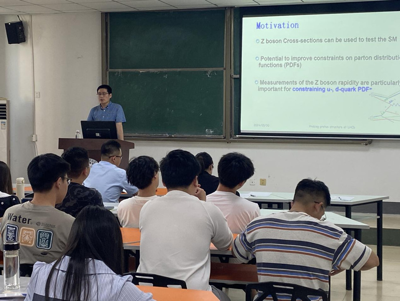 尹教授首先回顾了大型强子对撞机底夸克实验(LHCb实验)的发展历程,随后结合自己的科学研究,详细阐述了LHCb实验上关于Z玻色子产生截面以及质子内禀粲夸克的最新研究成果,为精确检验粒子物理标准模型以及深入理解质子内部结构提供重要信息。报告结束后,现场师生与尹教授进行了深入的交流和探讨。