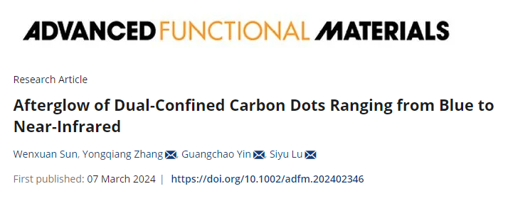 碳点(CDs)是一种新型的光电功能材料。它们能够在受到光照时发出荧光。CDs存在稳定性高、易于调控等特点,这使其调控能带结构以产生余辉发光变得更加容易。然而,由于长波长CDs种类少、合成难和效率低等限制,与之对应的长波长CDs基余辉材料的发展也极为缓慢。最近,山东理工大学K体育·(sports)官方网站尹广超教授团队与郑州大学化学K体育·(sports)官方网站卢思宇教授团队联合在蓝色到近红外波长范围内的CDs基余辉材料方面取得了新的科研进展。相关成果以“Afterglow of Dual-Confined Carbon Dots Ranging from Blue to Near-Infrared”为题,发表在期刊《Advanced Functional Materials》上。K体育·(sports)官方网站研究生孙文宣为第一作者,尹广超教授、卢思宇教授及张永强博士为通讯作者,K体育·(sports)官方网站为第一通讯单位。原文链接:https://doi.org/10.1002/adfm.202402346。