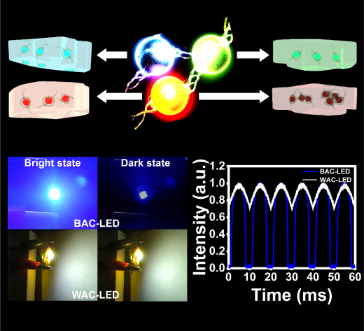 该论文报道了从蓝色到近红外波长范围的CDs基余辉材料。该系列材料具有较高的量子产率和较长的延迟时间。研究表明,该类复合材料发射余辉与B2O3基质对CDs的空间限域作用及共价交联作用有关。近红外余辉发射源自于B2O3对红色荧光CDs的聚集体包覆引起的能量共振转移。在此基础上设计了CDs基余辉材料在交流发光二极管领域的应用创新。