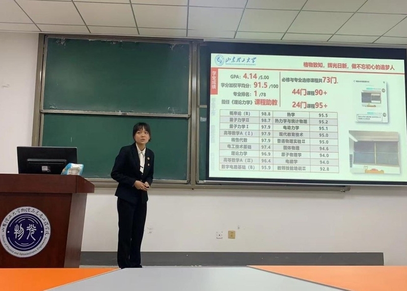 四位通过资格审核的同学按照会前抽签顺序依次上台答辩。答辩人通过个人陈述、PPT展示等全面介绍了自己在学业成绩、科研创新、社会实践、志愿服务等方面的情况。每位参评学生都以饱满的热情、清晰的逻辑、生动的语言向评委们展现了各自独特的魅力与风采。