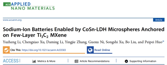 3. Sodium-Ion Batteries Enabled by CoSn-LDH Microspheres Anchored on Few-Layer Ti3C2 MXene. ACS Applied Nano Materials, 2024, 7(17), 20598-20608. (中科院二区 IF=5.3)原文链接:https://doi.org/10.1021/acsanm.4c03583