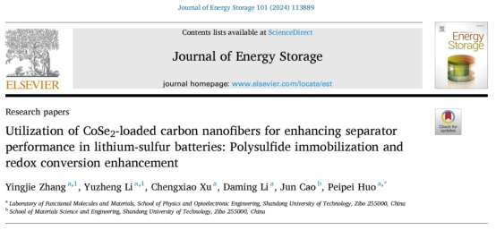 1. Utilization of CoSe2-Loaded Carbon Nanofibers for Enhancing Separator Performance in Lithium-Sulfur Batteries: Polysulfide Immobilization and Redox Conversion Enhancement. Journal of Energy Storage, 2024, 101, 103889. (中科院二区top IF=8.9)原文链接:https://doi.org/10.1016/j.est.2024.113889