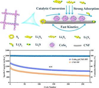 本文通过静电纺丝法成功地制备了负载CoSe2的碳纳米纤维(CoSe2@CNF),并将其应用于锂硫电池中作为聚丙烯膈膜的功能涂层。该材料在锂硫电池中的应用显著提升了其电化学性能,有效抑制了限制锂硫电池发展的穿梭效应,并提高了反应效率,解决了电池性能提升的关键难题。