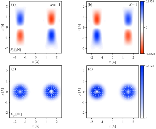 图. 聚焦高斯输入场下,作用于左手性(左列)和右手性(右列)的手性粒子在 x-z 平面 y=0 处的(a, b)纵向光学力和在 x-y 平面 z=0 处的(c, d)横向光学力分布。
