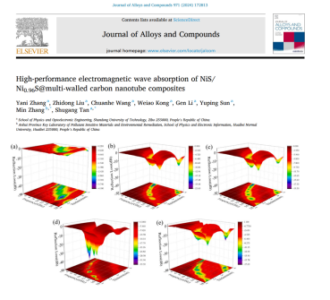 近日,K体育·(sports)官方网站谭树刚副教授指导团队在电磁波吸收领域取得重要进展。连续在国际知名期刊《Journal of Alloys and Compounds》、《ACS Applied Nano Materials》和《Dalton Transactions》上发表多篇论文。其中,K体育·(sports)官方网站硕士研究生王传河、孔维奥等分别为第一作者,谭树刚副教授为通讯作者。