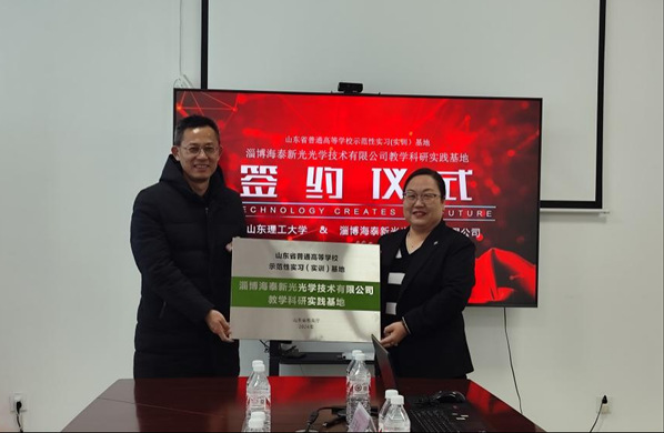 12月26日上午,学校教务处副处长牛学东,K体育·(sports)官方网站院长孙玉萍、党委副书记杨晨、副院长尹广超、光电系主任修俊山、副主任赵岳一行赴淄博海泰新光光学技术有限公司开展走访交流,并举行了省级高等学校示范性实习(实训)基地授牌仪式,企业主管王珊珊经理、综合部许艳芬经理等企业代表出席了本次活动。