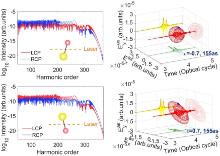 强飞秒激光与原子、分子、凝聚态物质及固体等物质相互作用时,可以产生高次谐波辐射,这是目前获得阿秒(10-18秒)脉冲的最主要途径。阿秒脉冲的超高时间分辨能力使科学家们能够探测、操控物质内部电子的动力学过程。2023年,阿秒光脉冲技术获得诺贝尔物理学奖。相比线偏振阿秒脉冲,椭圆偏振和圆偏振阿秒脉冲在探测物质手性、磁性等特性方面具有独特优势,近年来其产生备受关注。K体育·(sports)官方网站袁华博士提出利用电离门控制技术,可以实现对椭圆偏振阿秒脉冲旋性和椭偏率的有效操控。研究发现,在单色线偏振激光场驱动下,CO分子在相邻半个激光周期产生的阿秒脉冲旋性(左旋和右旋)会交替变化。通过引入一个弱的二倍频激光场形成电离门,能够选择性滤除特定旋性的阿秒脉冲,从而获得单一旋性的阿秒脉冲。此外,通过调整电离门激光场中CO分子的取向,可以有效调控脉宽为155阿秒的脉冲的旋性和椭偏率。该研究成果有助于产生可调谐旋性和椭偏率的阿秒脉冲,促进其在探究物质手性、磁性及相关动力学过程中的适用性。相关论文以 “Control of attosecond-pulse helicity and ellipticity by ionization gating technique” 为题发表在国际知名物理学期刊《Physical Review A》上。袁华博士为该论文的第一作者,孙玉萍教授为论文通讯作者,K体育·(sports)官方网站为第一通讯单位。