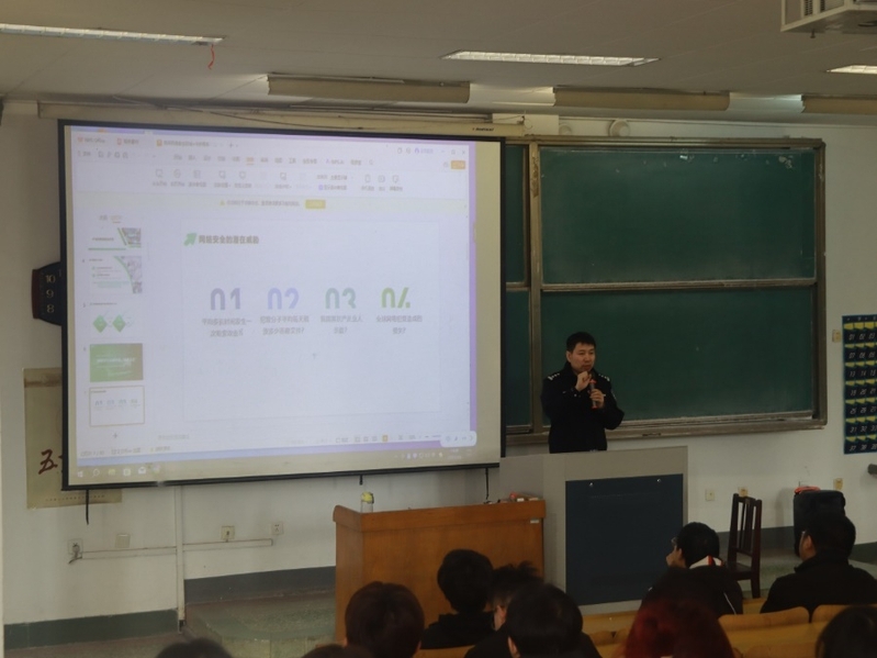 会议伊始,戴伟警官通过一组触目惊心的数据切入网络安全主题,展示了当前网络安全问题的严峻性,以及由此引起的关乎社会稳定的全局性问题。然后,戴伟警官针对校园场景,重点剖析了三大常见威胁。第一,钓鱼邮件与虚假链接。不法分子伪装成学校官方通知,诱导点击恶意链接。第二,公共Wi-Fi陷阱。校园开放网络易被植入监听程序,导致账号密码泄露。第三,社交工程诈骗。利用学生心理弱点,通过伪造身份实施金钱诈骗。同时,通过播放宣传视频的方式演示了U盘的病毒传播,并呼吁学生“不轻信、不透露、不点击”,筑牢第一道防线。