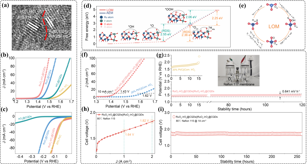 本研究主要利用石楠树叶衍生的碳量子点(CQDs)作为界面调控剂,成功构建了高效的RuO2-IrO2@CQDs异质结构催化剂。研究表明,该催化剂在0.5 M H2SO4中表现出优异的电催化性能:OER和HER在10 mA cm-2电流密度下的过电位分别低至180 mV和15 mV,组装的H型电解槽仅需1.43 V即可实现高效水分解。以该催化剂为阴阳极组装的工业电解槽在80 ℃的去离子水中仅需要1.64 V和1.82 V便可达到1 A cm-2和2 A cm-2的大电流密度,且电解槽在1 A cm-2的大电流密度下可稳定运行超过250 h无衰减。原位测试和理论计算表明,RuO2-IrO2@CQDs可以通过独特的晶格氧机制(LOM)路径绕过OOH*中间体,打破吸附演化机制(AEM)的线性关系,从而显著提升OER催化活性。