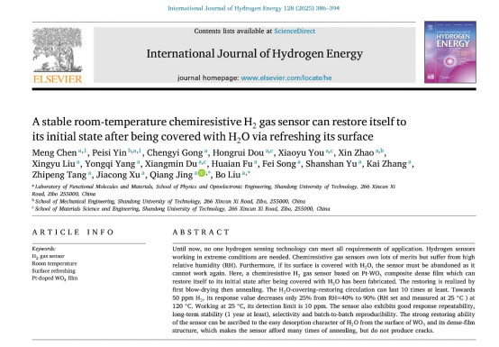近日,K体育·(sports)官方网站2024届本科生陈蒙(现就读于中科院上海微系统与信息技术研究所) 在景强副教授的指导下, 以第一作者身份在国际氢能International Journal of Hydrogen Energy(影响因子8.1,中科院2区)杂志上,以《A stable room-temperature chemiresistive H2 gas sensor can restore itself to its initial state after being covered with H2O via refreshing its surface》为题报道了一项较为有意义的发现。