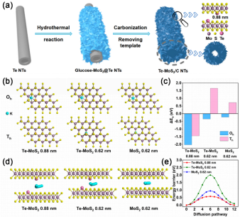 钾离子电容器(PICs)作为一种兼具高能量密度和功率密度的新型储能器件,正在受到广泛关注。然而,开发高性能的PICs负极材料,仍面临较大的挑战。本工作采用液相法合成了生长模板碲纳米管(Te NTs),并在其表面水热生长了含有葡萄糖的MoS2纳米片。随后,利用气化Te NTs的掺杂作用和高温碳化过程,最终得到Te掺杂的MoS2/葡萄糖衍生碳(C)一维中空复合纳米管(Te-MoS2/C NTs)。Te-MoS2/C NTs的一维中空结构源自Te NTs的模板效应,防止了MoS2的团聚,有效缩短了离子扩散路径,同时Te NTs还作为阴离子掺杂剂,提高了MoS2的导电性。Te-MoS2/C NTs中的葡萄糖衍生碳有助于形成少层MoS2,并促进其层间扩展,从而增强其结构完整性。此外,理论计算证明Te掺杂和层间扩展提高了K⁺的吸附能力和扩散动力学。作为储钾负极,Te-MoS2/C NTs表现出优异的循环稳定性和出色的倍率性能,在0.05 A g−1的条件下具有417.8 mAh g−1的高可逆容量,在5.0 A g−1下仍能保持215.0 mAh g−1的容量,在2.0 A g−1下循环300次后容量保持率为95.6%。此外,使用Te-MoS2/C NTs作为负极材料和活性炭(AC)组装的PICs实现了较高能量密度和功率密度输出(212.8 W kg−1时为113.0 Wh kg−1,12.1 kW kg−1时为 57.0 Wh kg−1),以及良好的循环稳定性。
