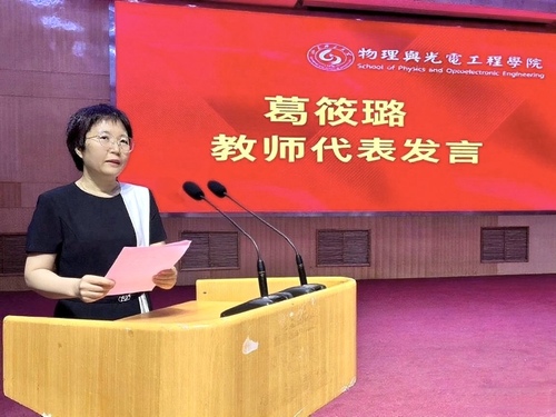 教师代表葛筱璐发言。她首先祝贺毕业生们顺利完成学业,昂首迈进人生新阶段。短短四载春秋,她见证了大家从青涩懵懂的少年逐渐成长为有目标、有担当的青年。她衷心祝愿同学们在未来的人生旅途中,既仰望星空,又脚踏实地;既敢于创新,也不忘初心;在风雨中前行不乱,于繁华中守住本心;在世界的喧嚣中,始终向下扎根,向上生长。