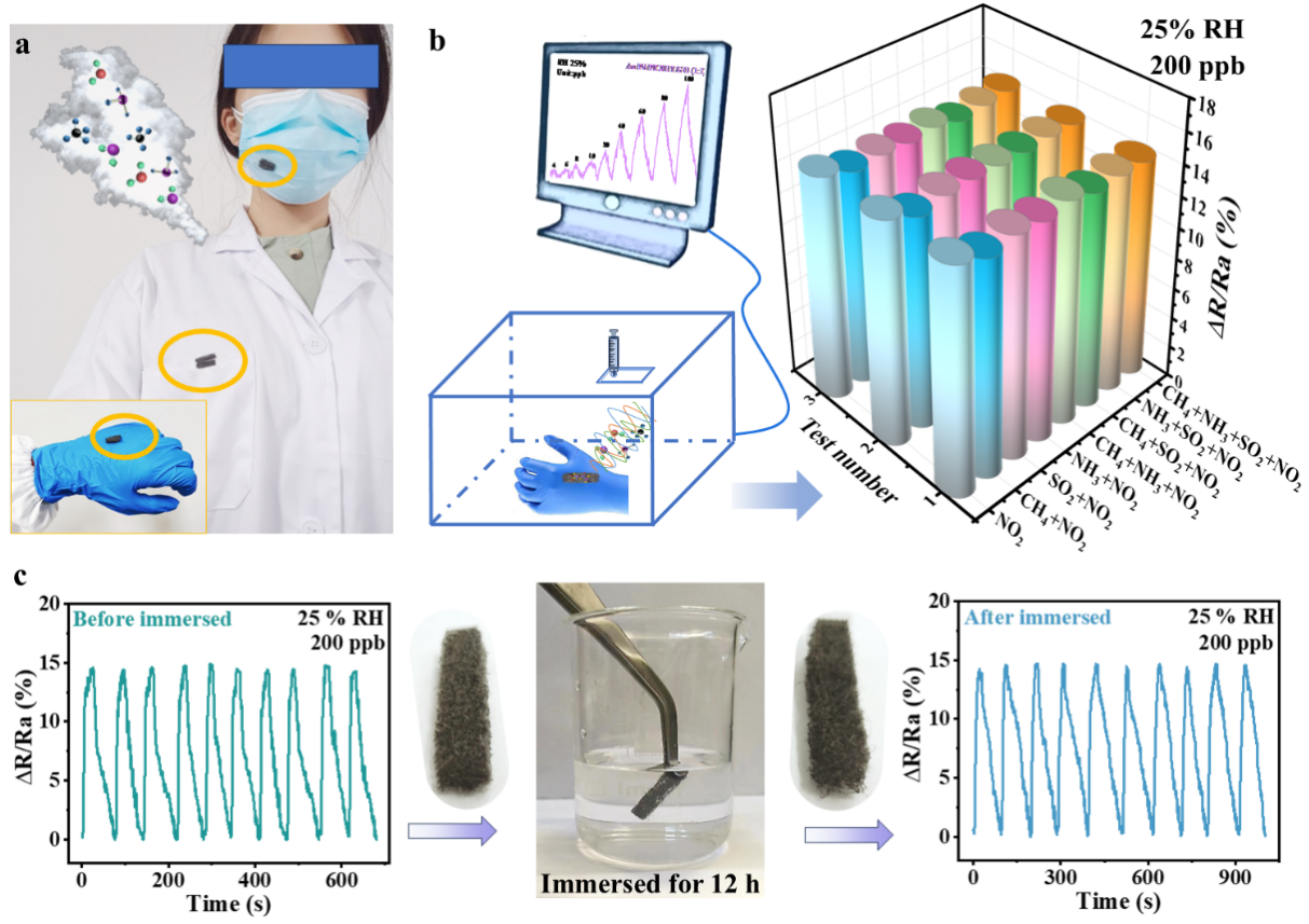 研究团队选用聚氨酯(PU)非织物作为柔性基底,以还原氧化石墨烯(rGO)作为导电介质,金/钯纳米颗粒(Au/Pd NPs)复合聚噻吩(PEDOT)材料作为传感层,采用“分步构建-原位组装”策略,成功制备了具有层级导电网络的Au/Pd&PEDOT@rGO@PU柔性传感器。该传感器在室温下对NO₂展现出卓越的传感性能:检测范围为0.1-800 ppm;在1 ppm浓度下灵敏度约为27%,响应和恢复时间分别仅为7s和38s,有效解决传统室温传感器“响应恢复慢”的痛点问题;最低检测限达2 ppb,远低于美国EPA(53 ppb)、ACGIH(200 ppb)规定的暴露阈值;选择性优异,对10 ppm干扰气体(H2S、CH4、NH3、SO2及VOCs如乙醇、甲醛等)的响应可忽略,在含200 ppb NO2+1 ppm干扰气的混合气体中仍保持对NO2信号的稳定检测。结合理论模拟分析,揭示了“双金属催化-电荷传输-界面耦合”的协同传感机制:Pd NPs催化NO2解离为活性自由基,Au NPs加速电子溢出传输,rGO与PEDOT的π-π作用及氢键增强电荷离域,同时Au/Pd与PEDOT形成的Schottky结促进了界面电子转移,为柔性气体传感器性能优化提供清晰的理论框架。